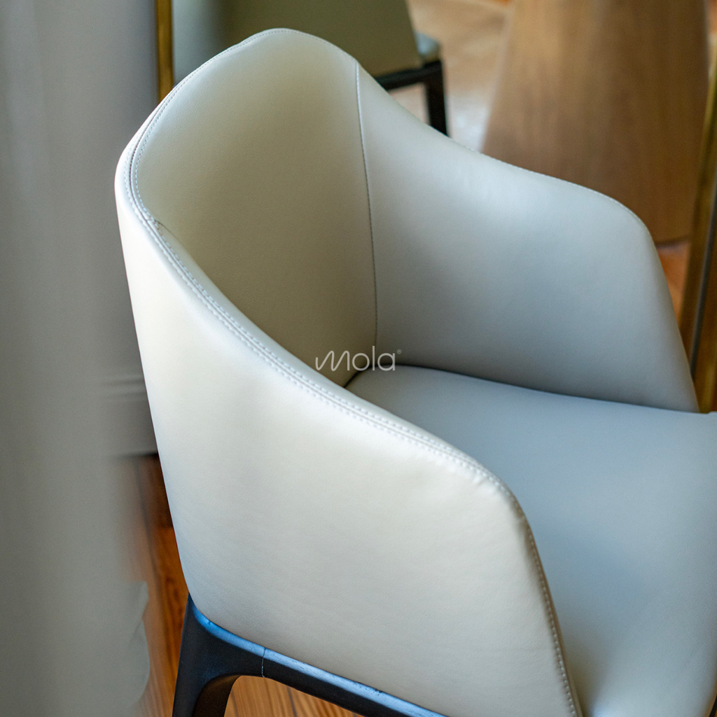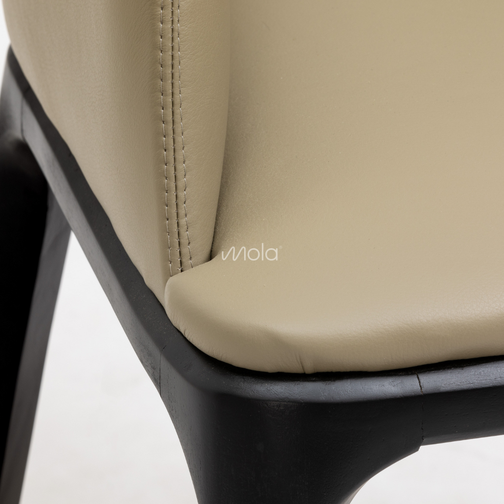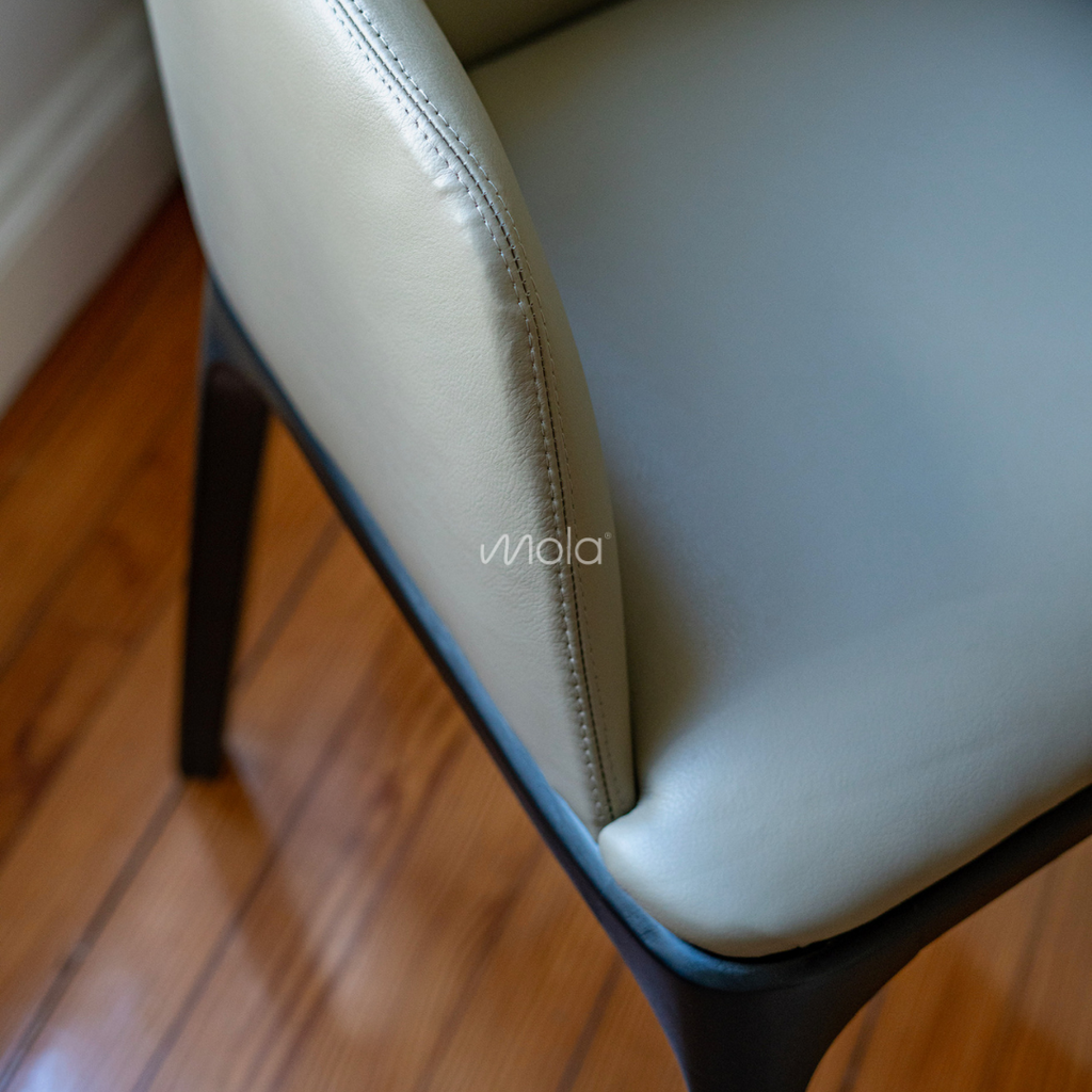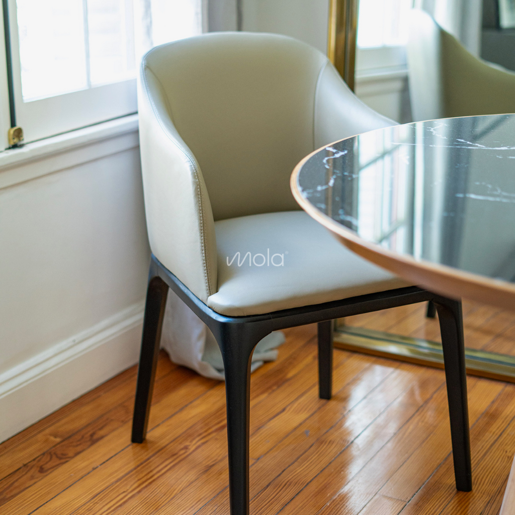 Sillón de cabecera MÓNACO, fino y elegante tapizado con patas en lustre negro. En la foto tapizado en cuero de Greevy.