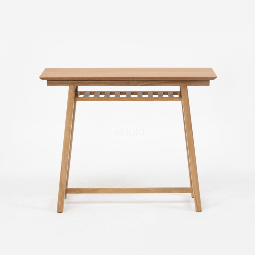 Consola realizada en madera maciza petiribí con tapa enchapada y con bordes biselados. Su original diseño la convierte en una pieza única y distinguida.