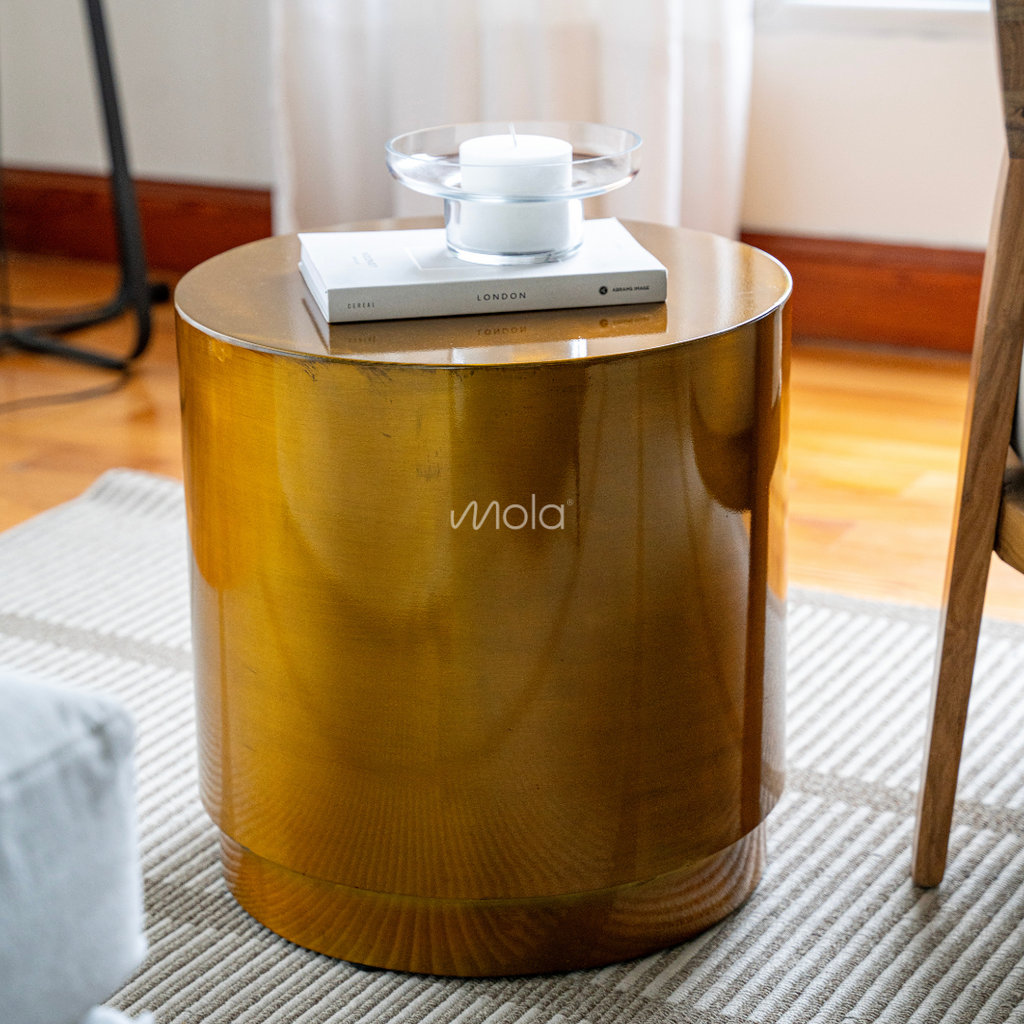 Elegante mesa de apoyo hierro pintada al horno color dorado. Ideal para aportarle un toque de color moderno al ambiente.