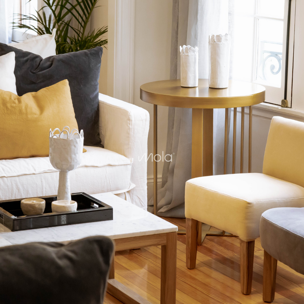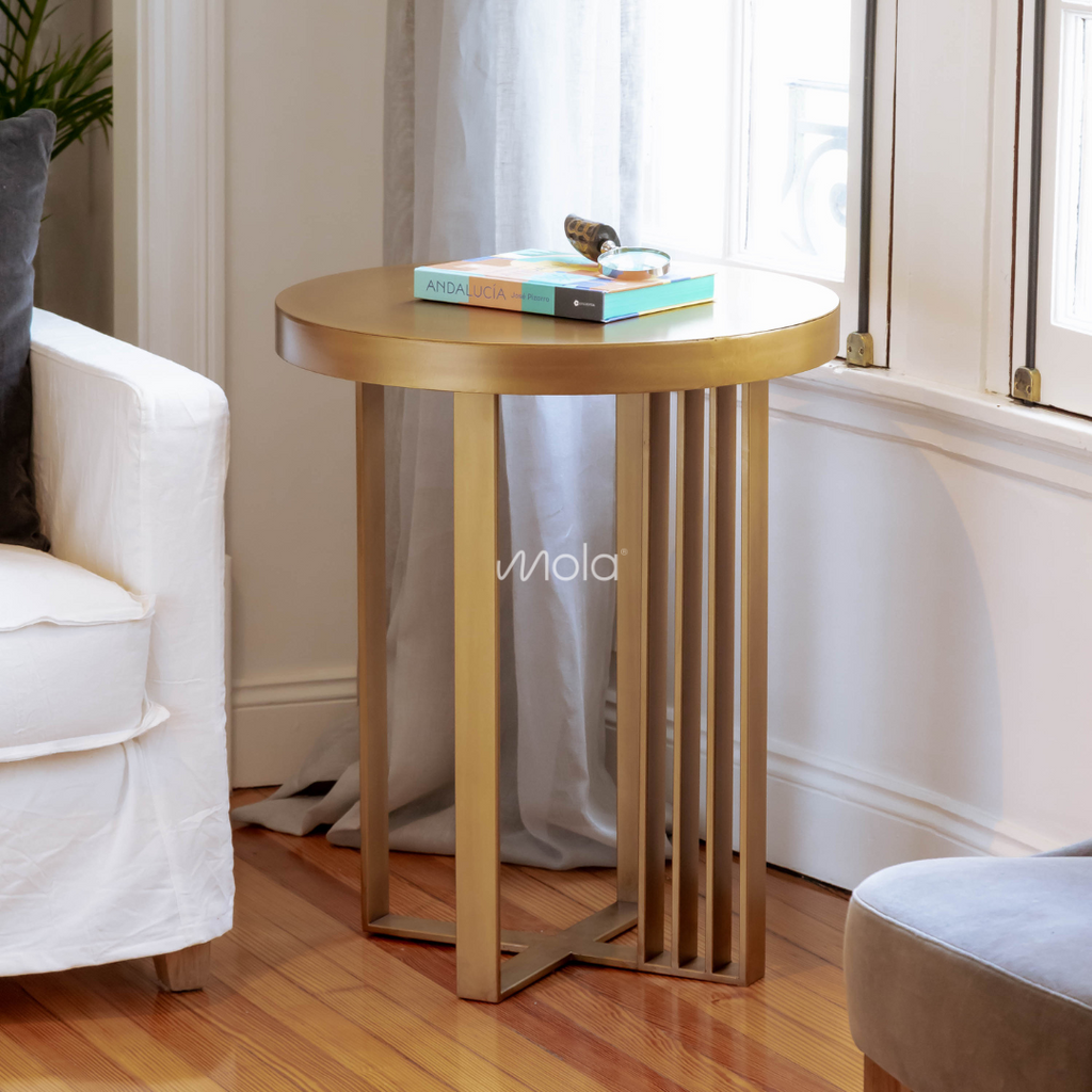 Mesa de apoyo realizada en hierro dorado pintado al horno. ¡Es divina y super elegante! Ideal para acompañar los sofás en el living o como mesa de luz para el dormitorio.
