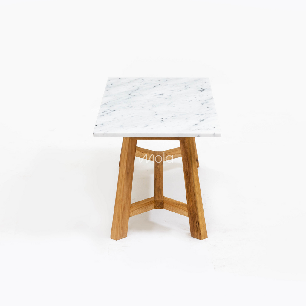 Elegante y sólida mesa ratona con patas en petiribí en forma de Y. Tapa en mármol carrara.