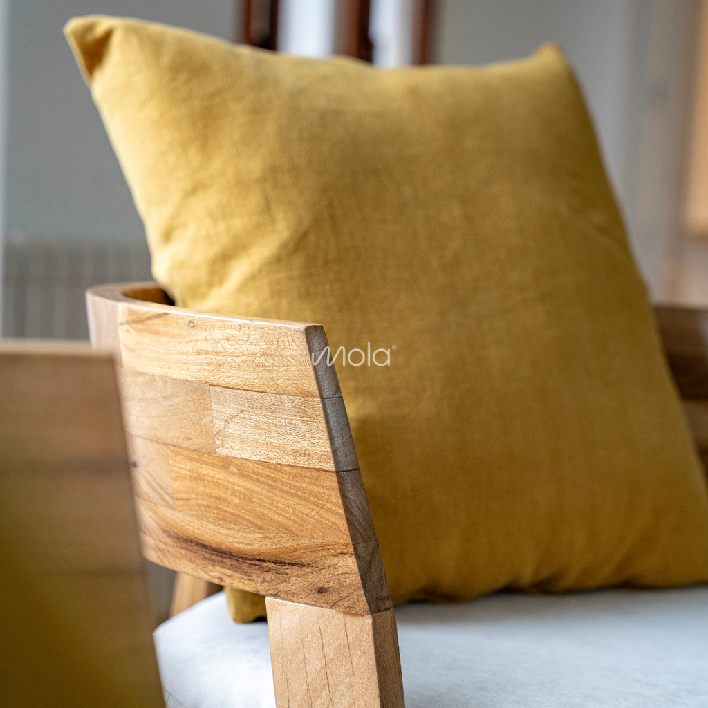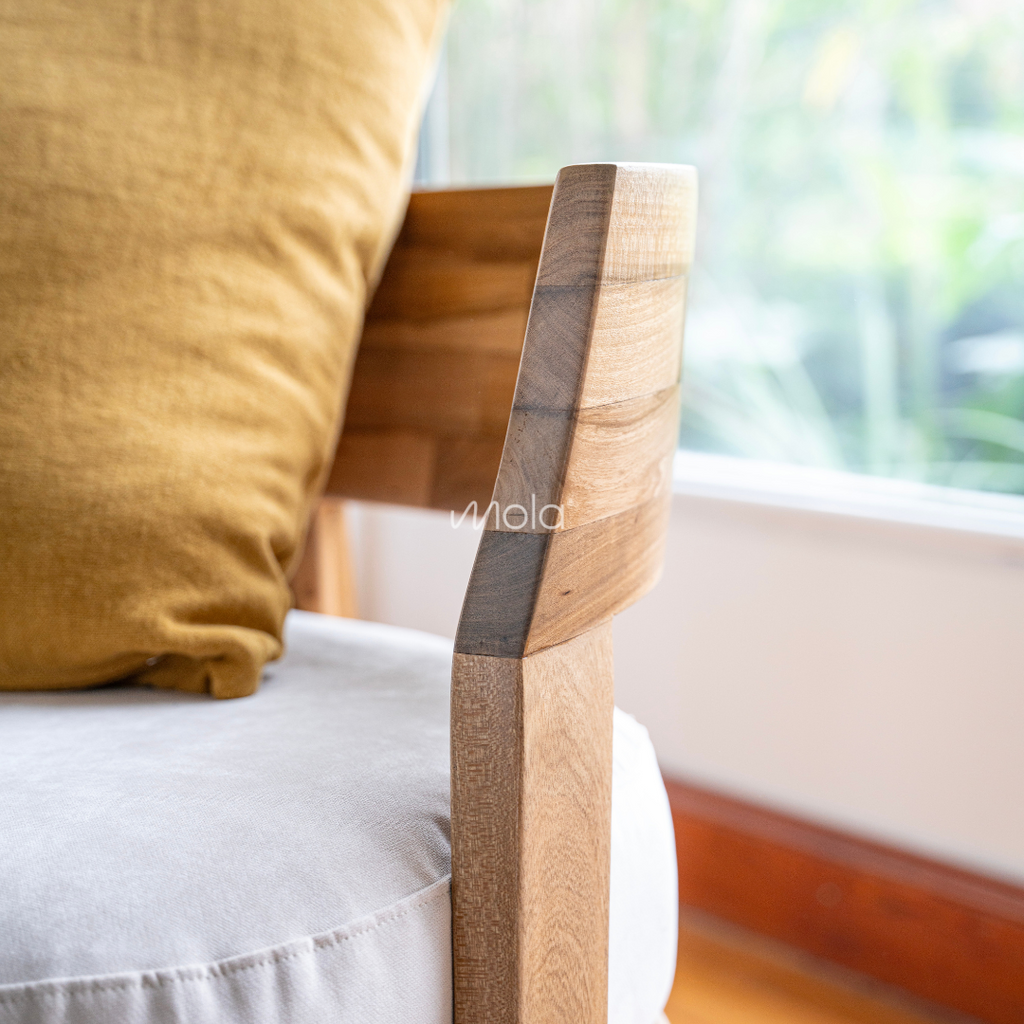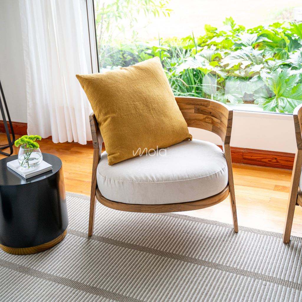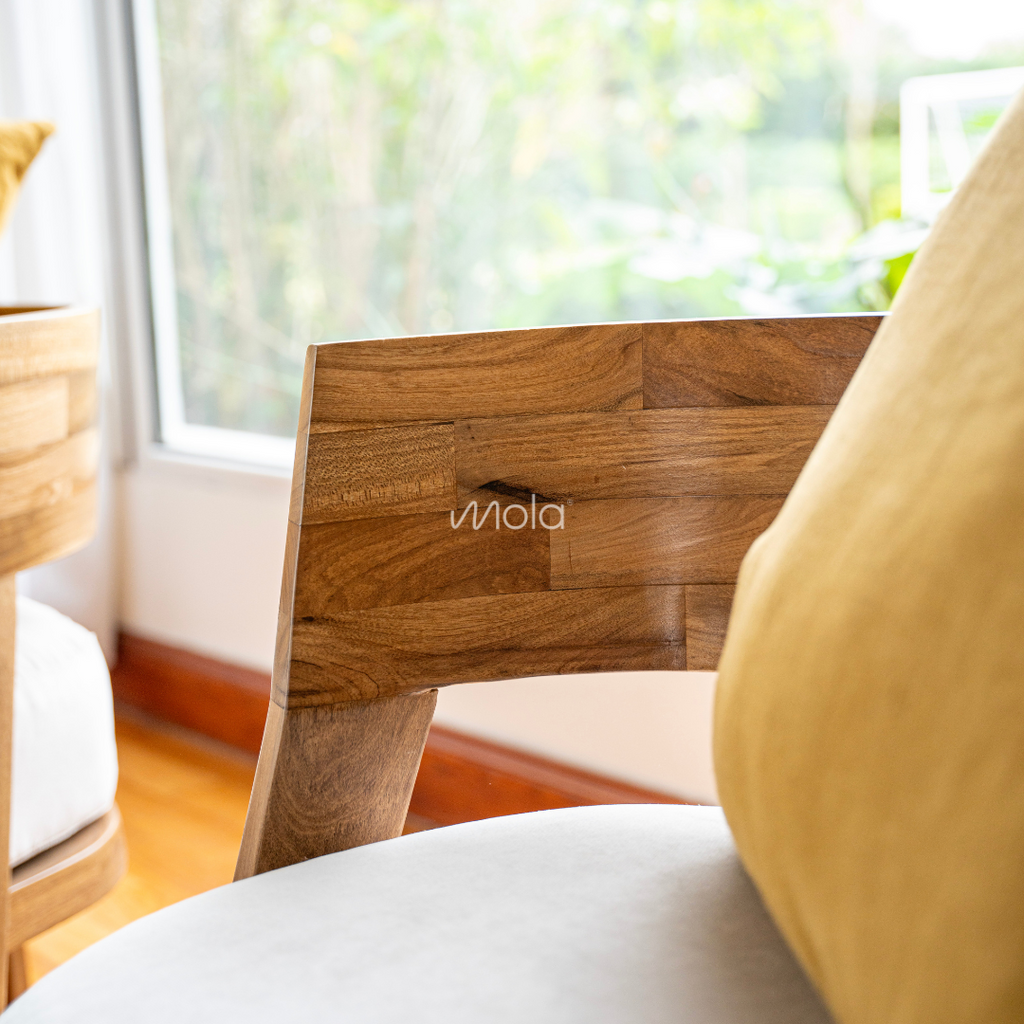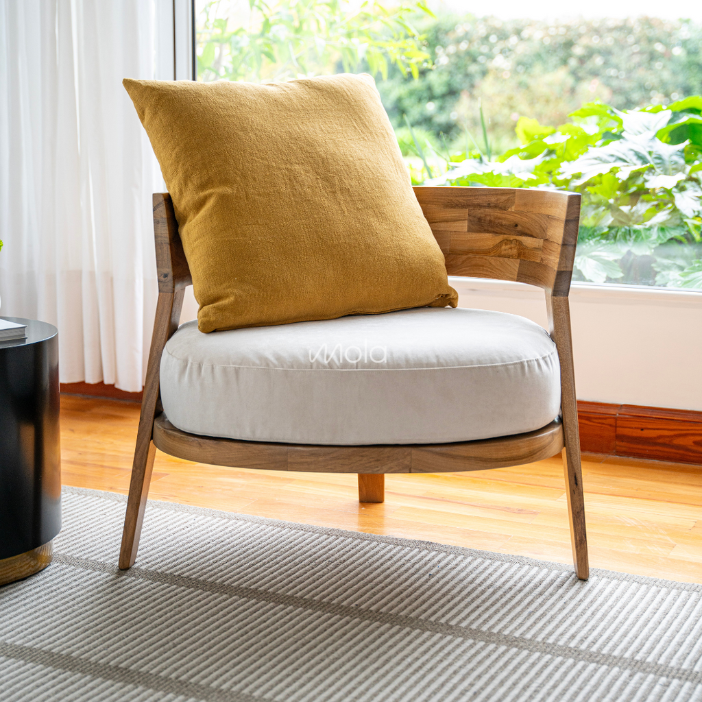 Sillón elegante en madera petiribí maciza. Incluye almohadón de asiento y respaldo como las fotos. También disponible en otras opciones de géneros y colores. Te invitamos a nuestro Showroom a elegir la combinación que más te guste.